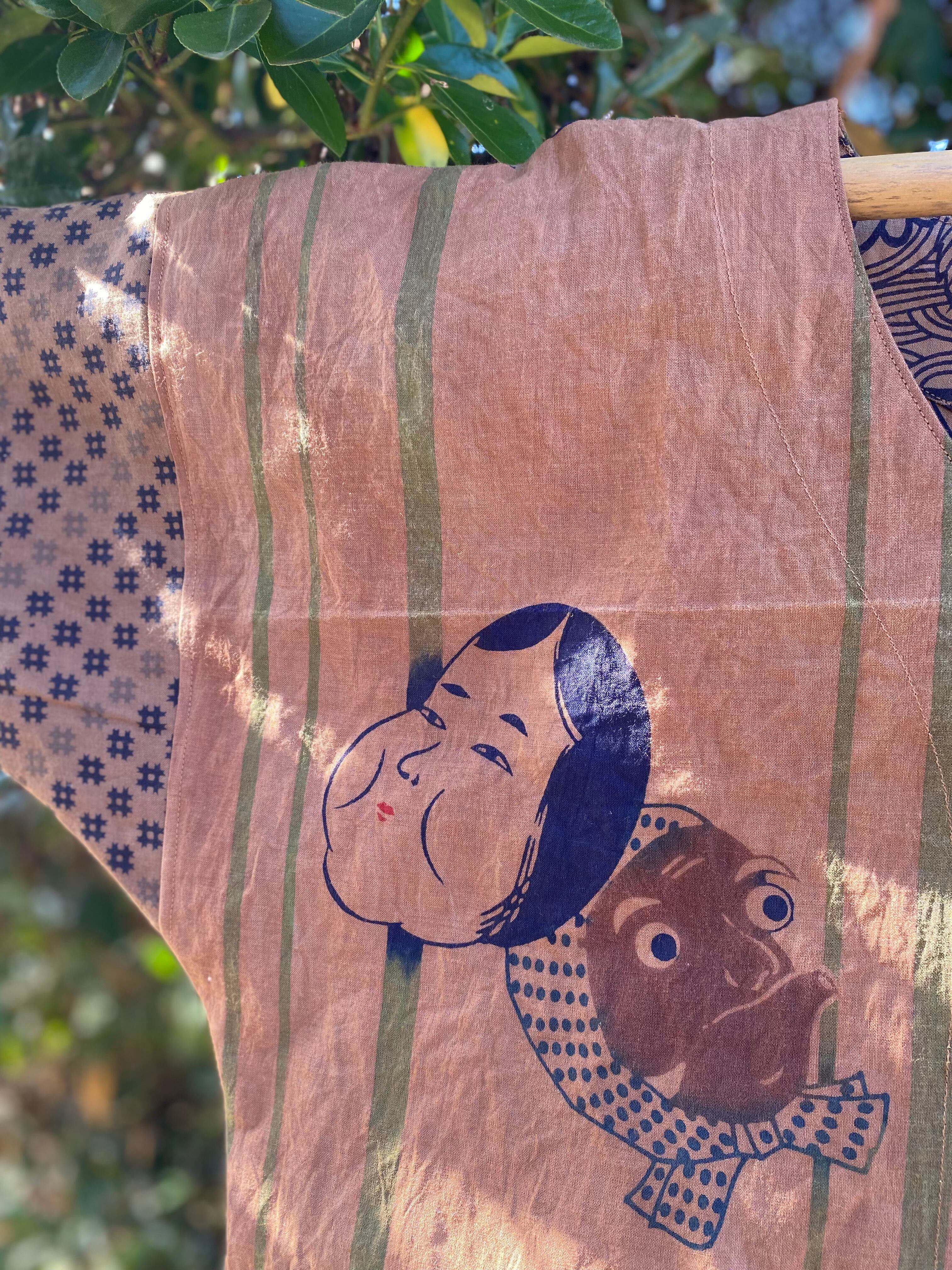 おかめひょっとこ柄の生地は写真で着ていただけるように折シワと染めムラあります。
